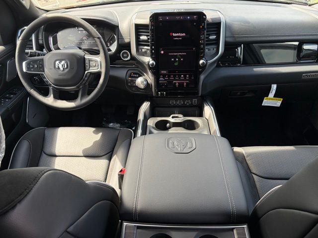 Inside, this truck is loaded with the right mix of luxury and technology. You get leather-trimmed bucket seats, heated and ventilated front seats, 8-way power driver and front passenger seats, and memory settings for the driver seat, mirrors, radio, and pedals. The Laramie Level 2 Equipment Group upgrades the cabin with a 14.4-inch Uconnect 5 NAV touchscreen, 12-inch TFT digital cluster, front passenger interactive display, power tailgate, 19-speaker Harman Kardon premium audio, and rain-sensitive windshield wipers.
