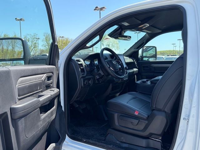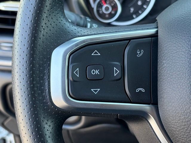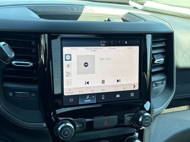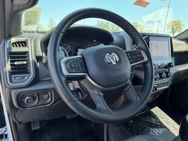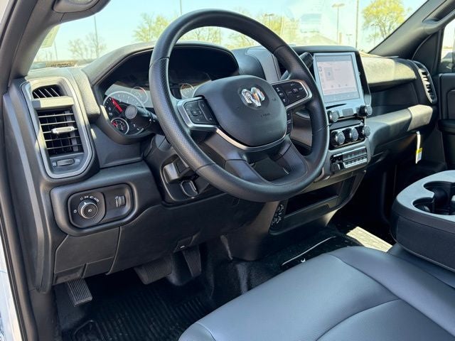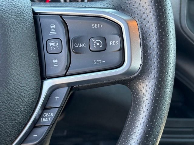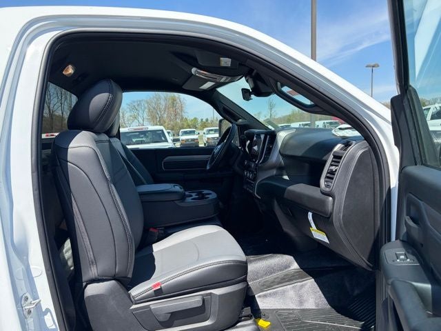 Inside, this Ram keeps it practical and functional with a heavy-duty vinyl 40/20/40 split bench seat, black vinyl floor covering, air conditioning, tilt steering column, and behind-the-seat storage. The Tradesman Level 1 Equipment Group adds the upgrades buyers want most, including trailer brake controller, power adjustable heated telescoping mirrors, power adjustable convex auxiliary mirrors, remote keyless entry, speed-sensitive power locks, and power windows with one-touch down. You also get Uconnect 5 with an 8.4-inch touchscreen, SiriusXM capability, integrated voice command, and a full-function media hub with USB and aux ports.