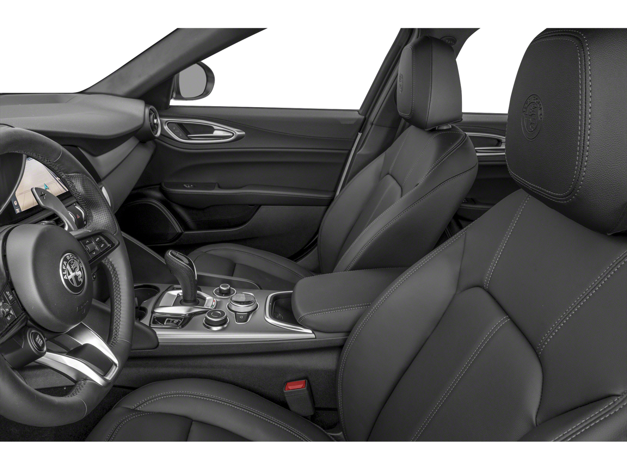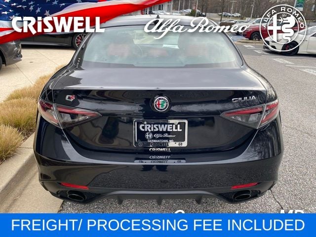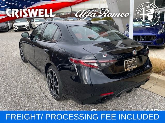 Vulcano Black Metallic 2025 Alfa Romeo Giulia Veloce AWD 8-Speed Automatic I4 AWD, Vulcano Black Metallic, Red Leather Sport Seats, 14 Speaker harman/kardon Premium Audio, ABS brakes, Active Driving Assist System, Alloy wheels, Compass, Driving Assist Package, Dual-Pane Sunroof, Electronic Stability Control, Front dual zone A/C, Gloss Red Calipers w/White Script, Heated door mirrors, Heated front seats, Heated rear seats, Illuminated entry, Intelligent Speed Assist (ISA), Leather Dash & Upper Doors, Leather Seats, Limited Slip Differential Rear Axle, Low tire pressure warning, Navigation System, Power Adjustable Bolster, Premium Interior & Sound Package, Red Leather Sport Seats, Remote keyless entry, Silver Veloce Badge, Sport Leather Seats, Thatcham Security Equipment, Traction control, Veloce Package AWD, Wheels: 19 x 8.0 Sport 5-Hole Aluminum.