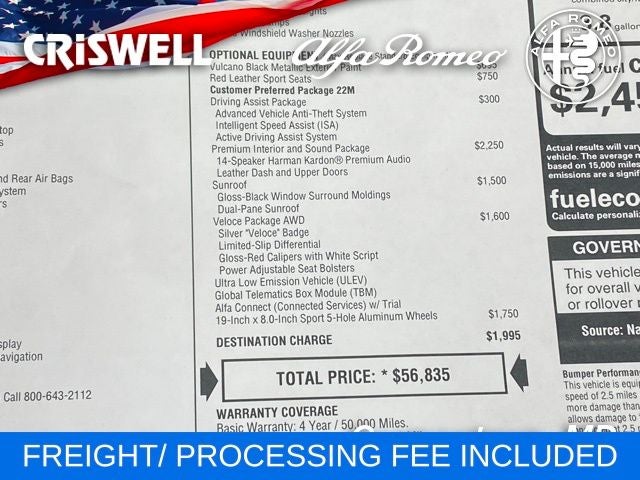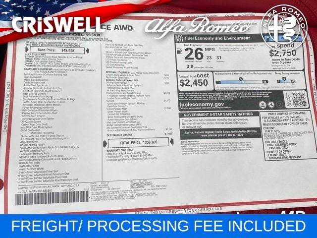 The New Vehicle Internet Sale Price (ePrice) includes applicable rebates, incentives, dealer discounts, destination/freight, and $800 Dealer Processing Fee (not required by law). Tax, title, and registration fees are additional. EPrices are valid on in-stock units only and are based on manufacturer incentive program time periods. Residency restrictions apply. Prices, specifications, and availability are subject to change without notice. Financing is subject to credit approval. Pictures are for illustrative purposes only. Offers not valid on prior sales. We make every effort to provide accurate information; please verify options and price before purchasing. For additional information please contact Criswell Alfa Romeo Sales Department alfasales@criswellauto.com. www.criswellalfa.com.
